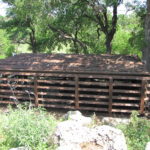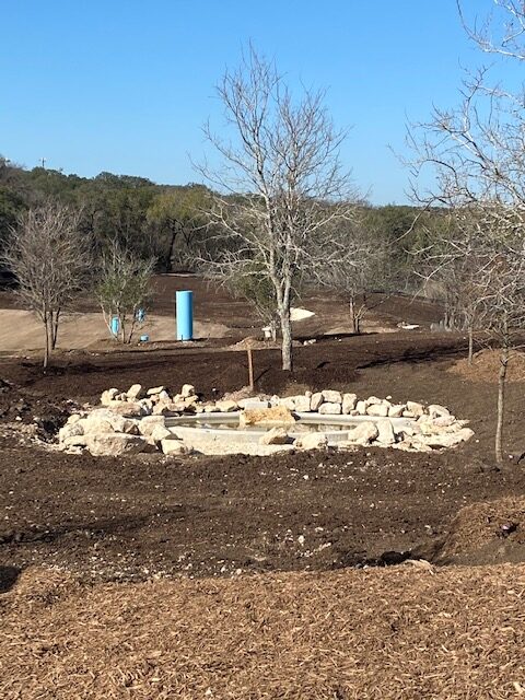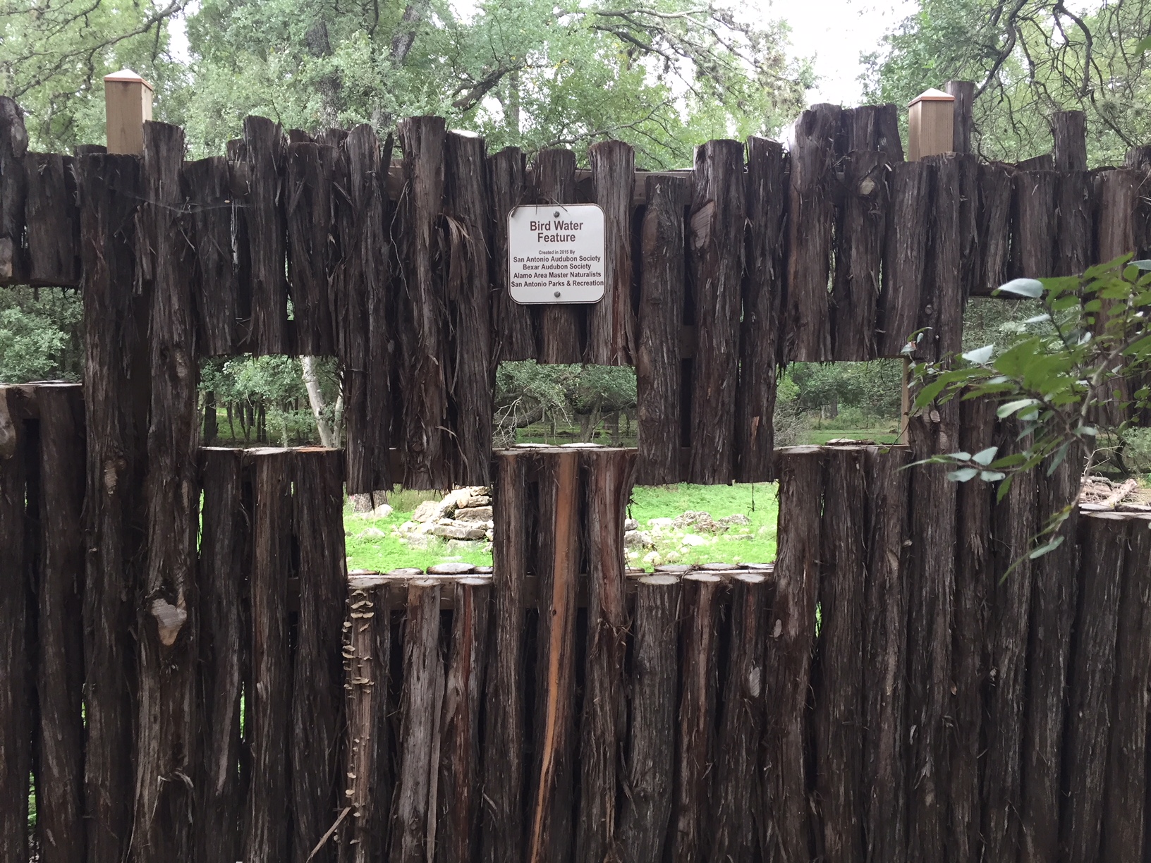 The Bird Water Feature is a small pond fed with recycled water and surrounded by rocks. It's located on the east side of the Salado Classroom building near the Blanco Rd. parking lot. A cedar post fence with cut-outs for viewing and photography stands in front of the water feature.