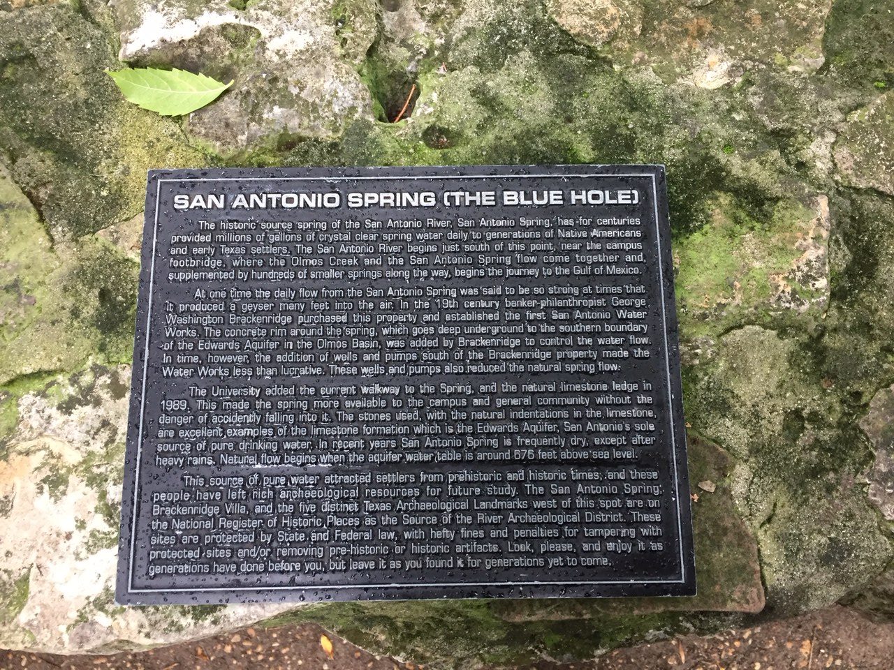 The Blue Hole is considered the source spring of the San Antonio River and is located in the 53-acre Headwaters nature sanctuary on the campus of the University of the Incarnate Word. Headwaters is a non-profit sponsored Earth care ministry of the Sisters of Charity of the Incarnate Word. Headwaters is adjacent to but not part of the University. Abundant rainfall in September raised the Edwards Aquifer level above 672 ft., causing the Blue Hole waters to flow again following a long period of drought.