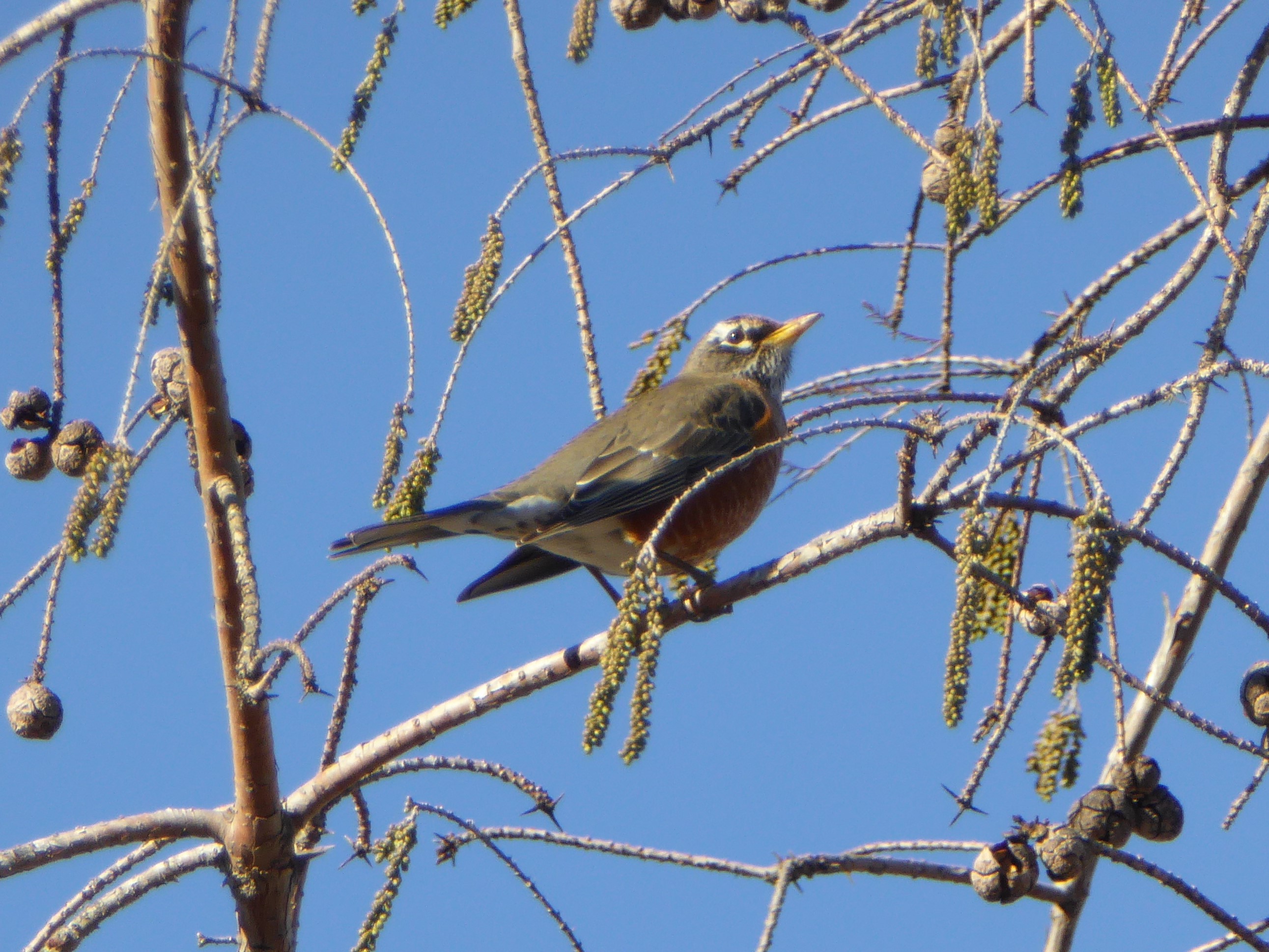 The Third Saturday Bird Walk at SABG started out cold (38 degree wind chill) and very windy (gusts to 37 mph), but the sun was shining and the sky was clear. We saw 26 species of birds, including American Robin, Cooper's Hawk, Loggerhead Shrike, Red-shouldered Hawk, White-throated Sparrow and Long-billed Thrasher.