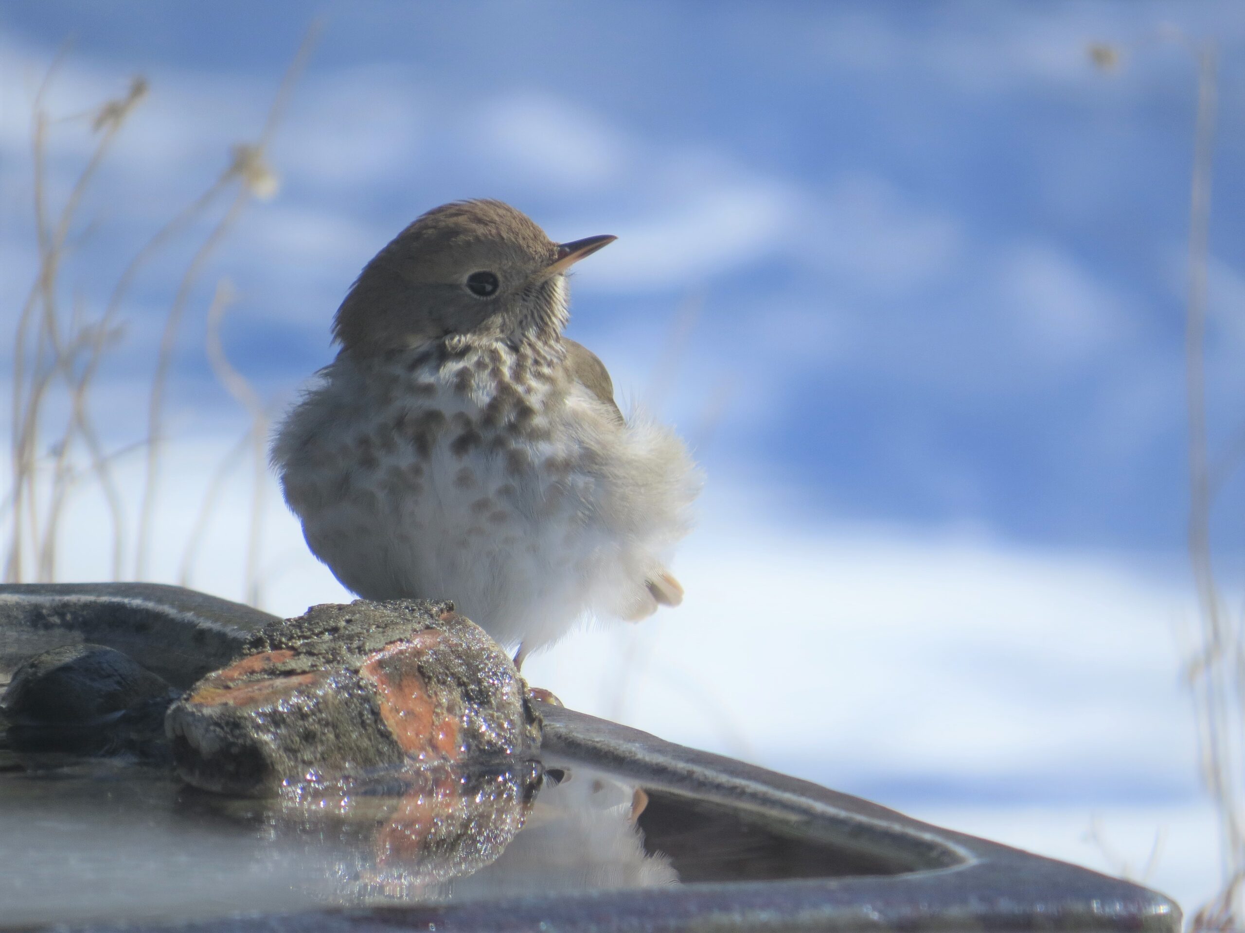 A very unusual event occurred in San Antonio last night, with 6" of snow falling and temps dipping to just 9 degrees. This morning, we woke up to a winter wonderland, as did our feathered friends. For the first time ever, a Hermit Thrush appeared in the backyard and sat for a bit at the birdbath, which had thawed with the help of a bucket of hot water. A Pine Siskin visited the snowy thistle feeder.