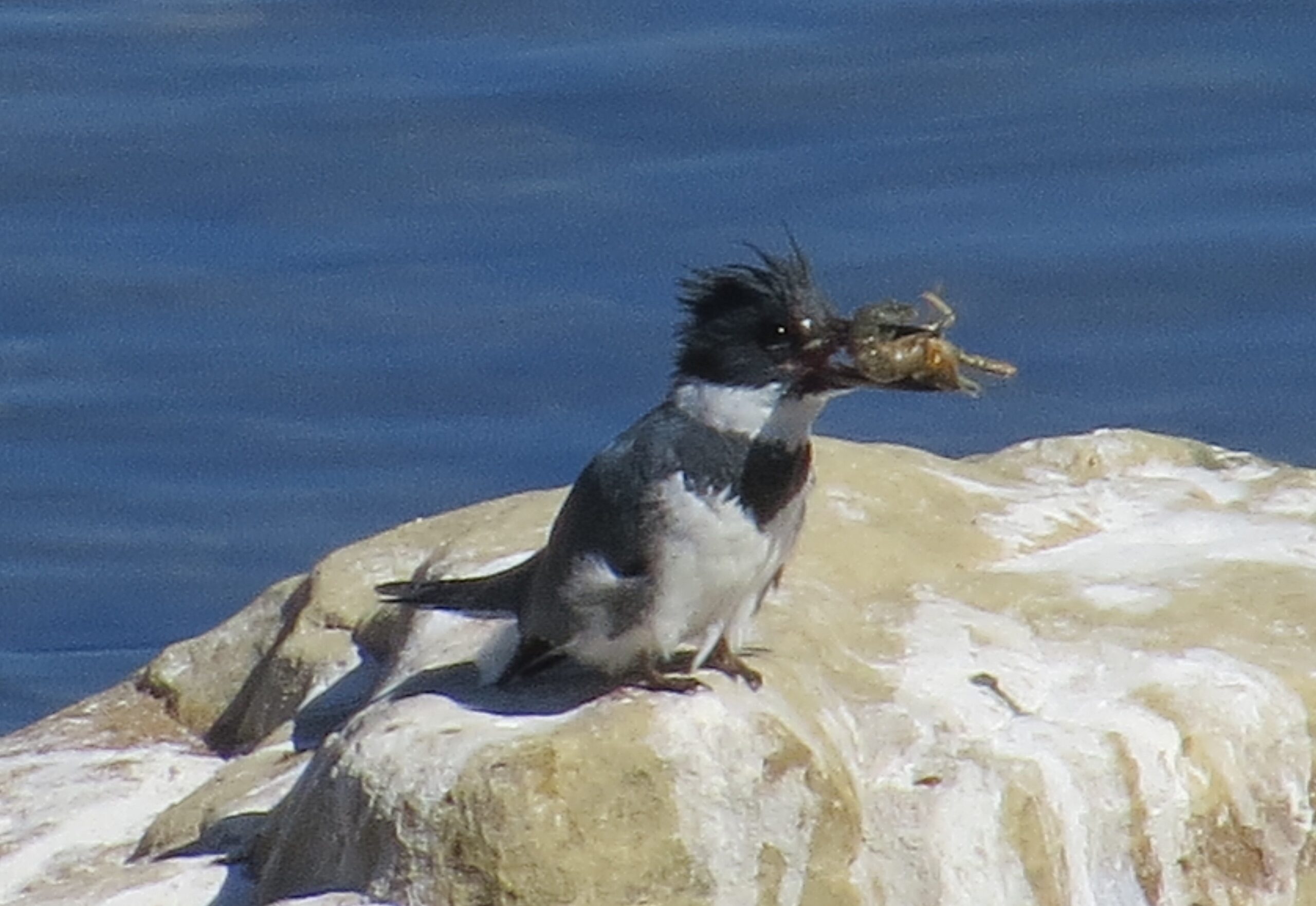 Local birders doing a survey for the San Antonio River Authority in Concepcion Park, south of downtown, discovered a Blue Bunting along the San Antonio River on February 24, 2021. The bunting is normally found in Mexico and occasionally appears in the Rio Grande Valley in deep South Texas. The Blue Bunting is a life bird for much of the San Antonio birding community, so the visitor attracted abundant attention. My photo was taken on March 2 across the river from where the bird perched in a tree branch. I used a zoom lens, and the photo is not great, but I was happy I was able to see this beautiful rarity. Concepcion Park has numerous water fowl, shorebirds, raptors, and songbirds. I was thrilled to see a male Belted Kingfisher enjoying a crustacean for lunch, along with an elegant Snow Egret and a Greater Yellowlegs (standing on one yellow leg with the other tucked underneath) nearby.